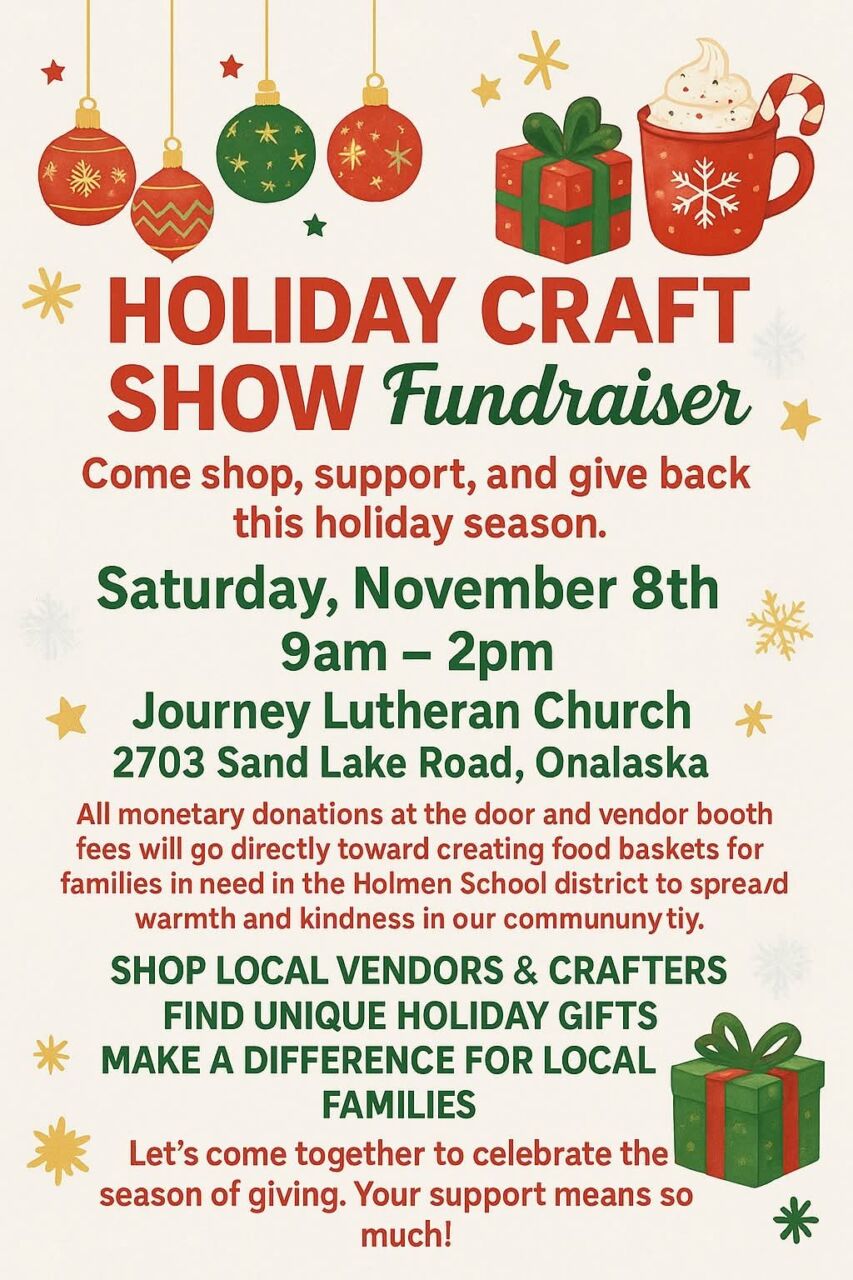 Journey Lutheran Church 2703 Sand Lake Rd., Onalaska, WI, United StatesHoliday Craft Show Fundraiser Come shop, support, and give back this holiday season. Saturday, November 9th9am - 2pmJourney Lutheran Church2703 Sand Lake Road, Onalaska All monetary donations at the door and vendor booth fees will go directly toward creating food baskets for families in need in the Holmen School district. These baskets will be given […]