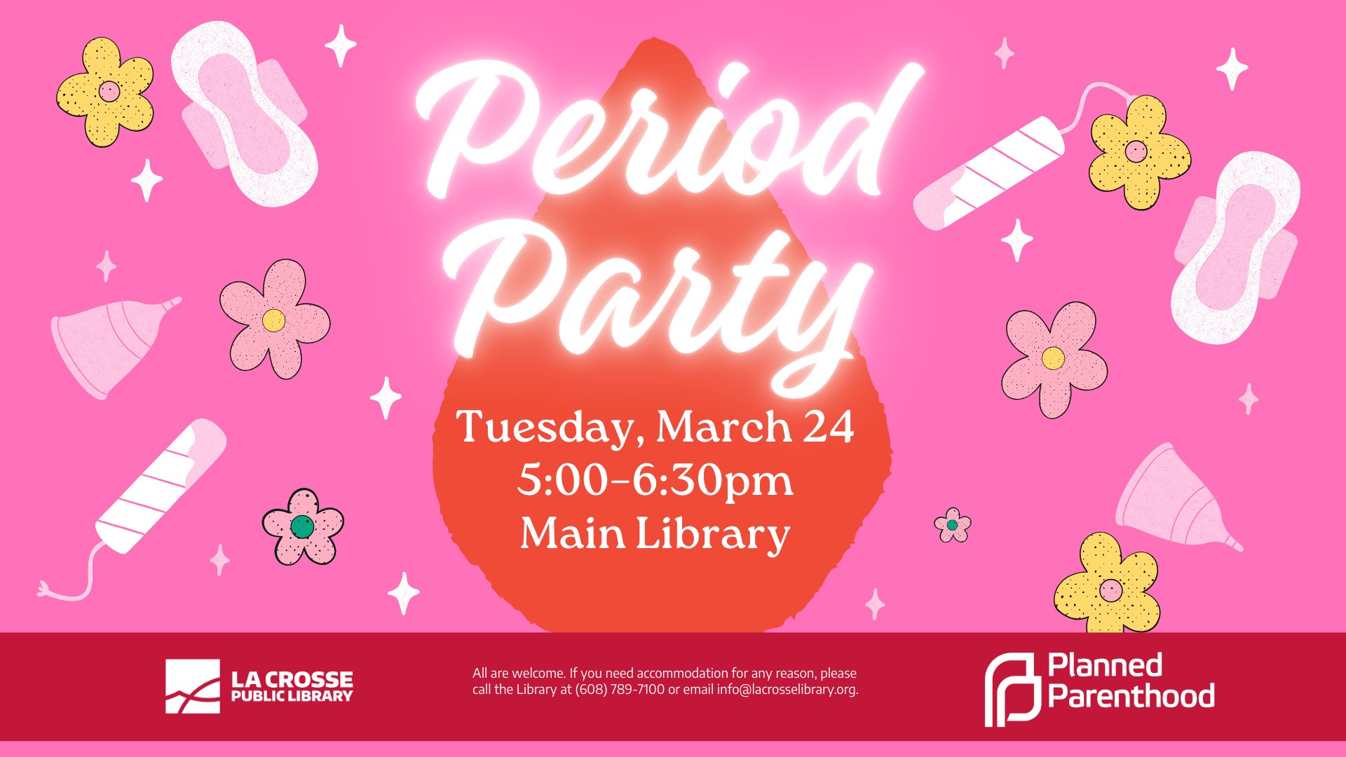 Celebrate by crafting, snacking, and learning all about menstruation at the La Crosse Main Library with partners from Planned Parenthood. Best for ages 9-18. All genders welcome.